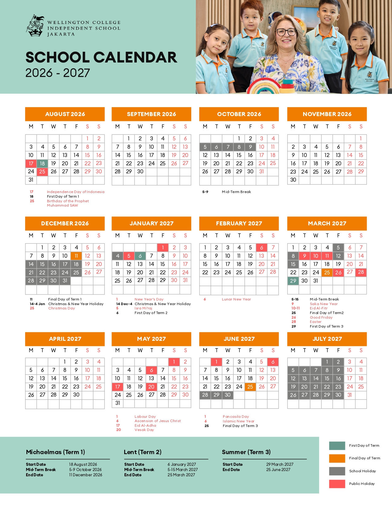 Our academic year begins from August to June, divided into three terms. Major Indonesian and international holidays are applied into consideration when determining the calendar.